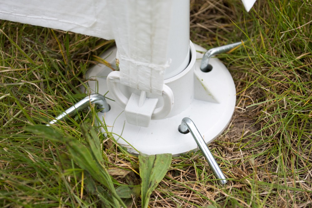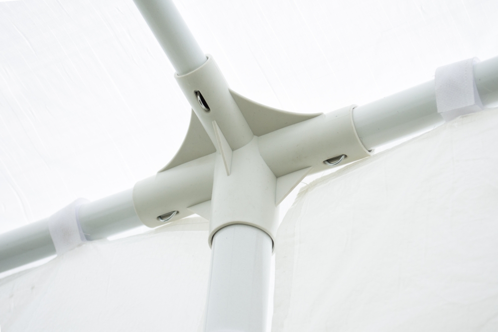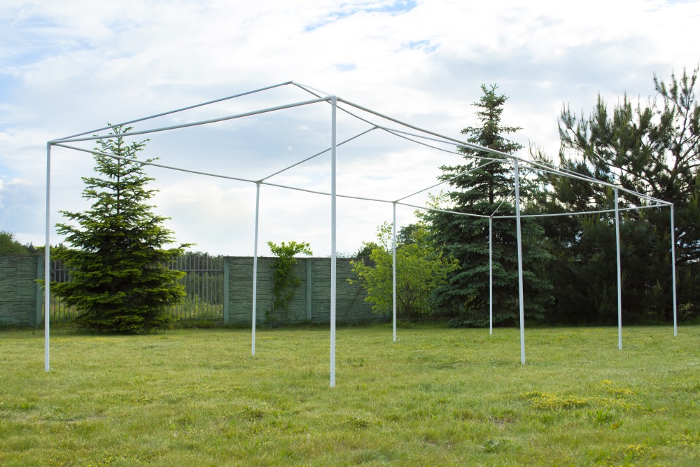 - Rám byl vhodně vyztužen a je velmi stabilní. K zemi je připevněn pomocí kolíků a čepů.
